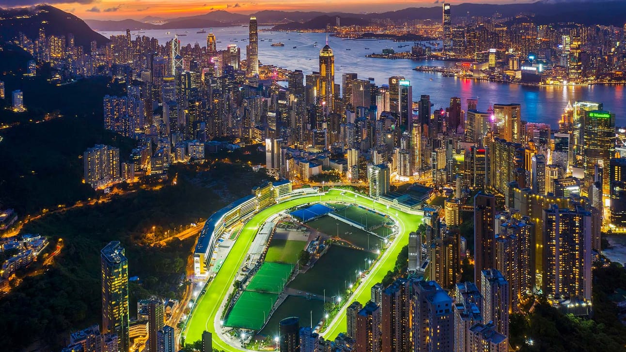 At the Happy Valley Racecourse, stands are ringed at night by one of the sport’s most extravagant views - Neon skyscrapers and neat stacks of high-rise buildings.